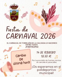 AGENDA CAMPAÑA DE NAVIDAD 2025 CONCEJALÍAS TRÁMITES AVISOS SEDE TRIBUTARIA MAPA INTERACTIVO INTERVENCIONES URBANAS NEWSLETTER INCIDENCIAS LIMPIEZA Y GESTIÓN DE RESIDUOS BANDOS ALCALDE EQUIPO DE GOBIERNO EL MUNICIPIO Toda nuestra historia, cultura y tradiciones, lugares de interés donde pasar un excelente día de turismo AYUNTAMIENTO Horario de At. al Público: Horario de Mañana- Lunes a Viernes: 9:00-14:00 h. CONTACTO Si deseas contactar con tu ayuntamiento lo tienes muy fácil rellenando el formulario. En cuanto podamos te daremos contestación SEDE ELECTRÓNICA Para la realización de todo tipo de trámites online con identificación electrónica, o bien escritos y solicitudes SEDE TRIBUTARIA Pago, consultas y acceso a la información On-line de los tributos municipales PARTICIPA En Torrejón de la Calzada cambiamos nuestra forma de participar. Abrimos nuevos cauces donde influir, donde tomar parte SERVICIOS Toda información sobre Farmacias, información catastral, tfnos de Interés, atención Sanitaria, seguridad ciudadana (Policía Local y Protección Civil), registro civil, transportes públicos, punto limpio, empleo NOTICIAS Todas las noticias corporativas y ciudadanas que surgen en nuestro municipio para ser consultadas en un minuto ÚLTIMAS NOTICIAS CONCURSO DE DISFRACES – CARNAVAL 2026 Actualidad | Agenda 16 de febrero de 2026 Leer más Calendario Fiscal 2026 – Impuestos y Tasas Municipales Actualidad | Agenda 11 de febrero de 2026 Leer más YA DISPONIBLES LAS BONIFICACIONES EN TRIBUTOS MUNICIPALES Actualidad | Agenda 4 de febrero de 2026 Leer más CONTACTO Plaza de España, 3 - 28991 Torrejón de la Calzada Tel: 91 816 00 01 Fax: 91 816 60 28 info@aytotorrejoncalzada.org Nombre Email Asunto Mensaje He leído la política de privacidad GALERÍA MULTIMEDIA Aquí verás diferentes galerías de fotos de los eventos, actividades, noticias etc para su consulta. VER TODAS PLENOS EN DIRECTO Si deseas ver en directo los plenos del ayuntamiento cómodamente desde tu casa, te invitamos a abrir el enlace. VER PLENO TABLÓN DE ANUNCIOS Toda información carteles de cultura, deportes, ofertas de empleo, bandos etc… VER TODOS