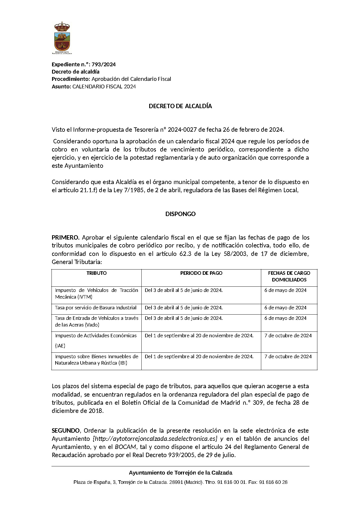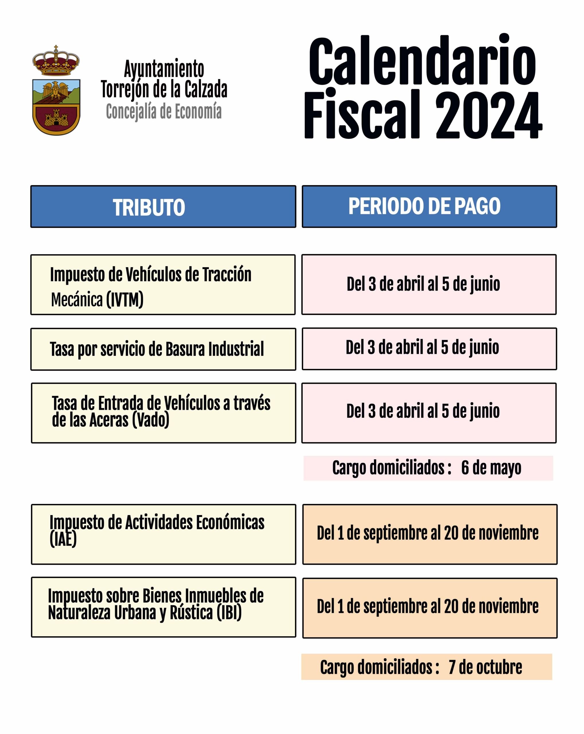 Aprobación del calendario fiscal en el que se fijan las fechas de pago de los tributos municipales de cobro periódico por recibo, y de notificación colectiva, todo ello, de conformidad con lo dispuesto en el artículo 62.3 de la Ley 58/2003, de 17 de diciembre, General Tributaria.