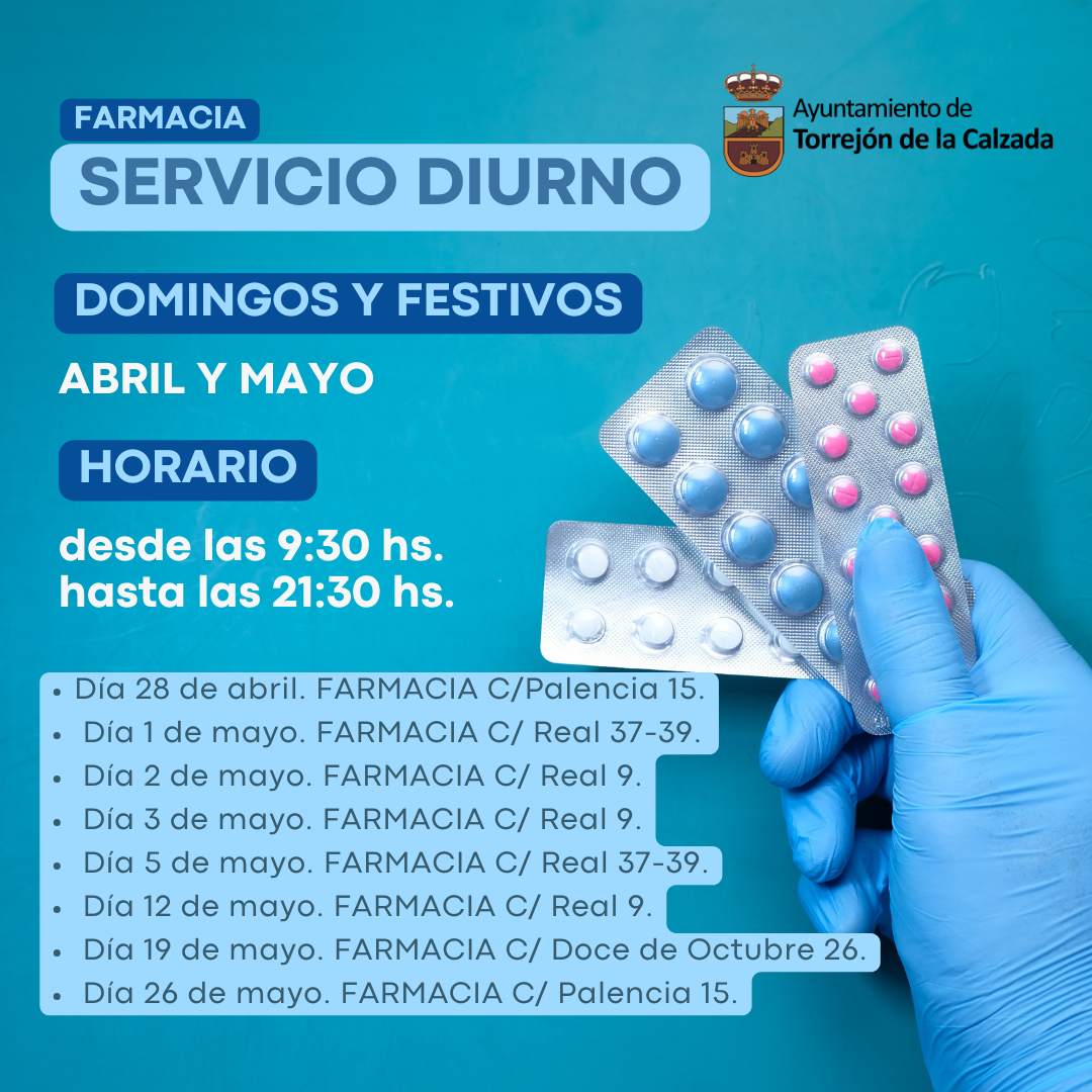 Desde el mes de abril, se ha implantado en nuestro municipio el servicio diurno de Farmacia teniendo garantizado el servicio de Lunes a Domingo incluido festivos.