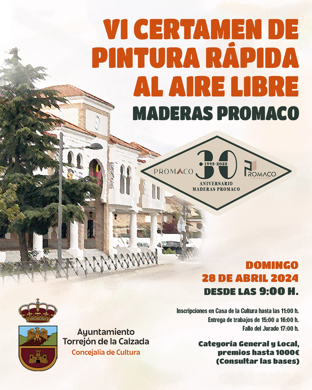 El Ayuntamiento de Torrejón de la Calzada, a través de la Concejalía de Cultura y de la Escuela Municipal de Dibujo y Pintura, convoca el VI Certamen de Pintura rápida al aire libre del ayuntamiento de Torrejón de la Calzada 2024 “Maderas Promaco” , que se celebrará el 28 de abril de 2024 .
